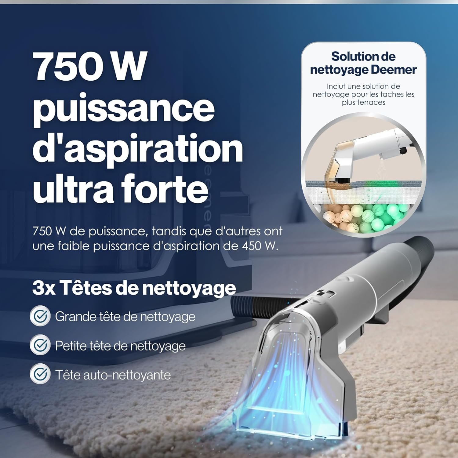 | Deemer Shampouineuse Portable D01 | 159,99€ | 750 W | 1 L | non communiqué | 2 têtes | 4,3/5 |
