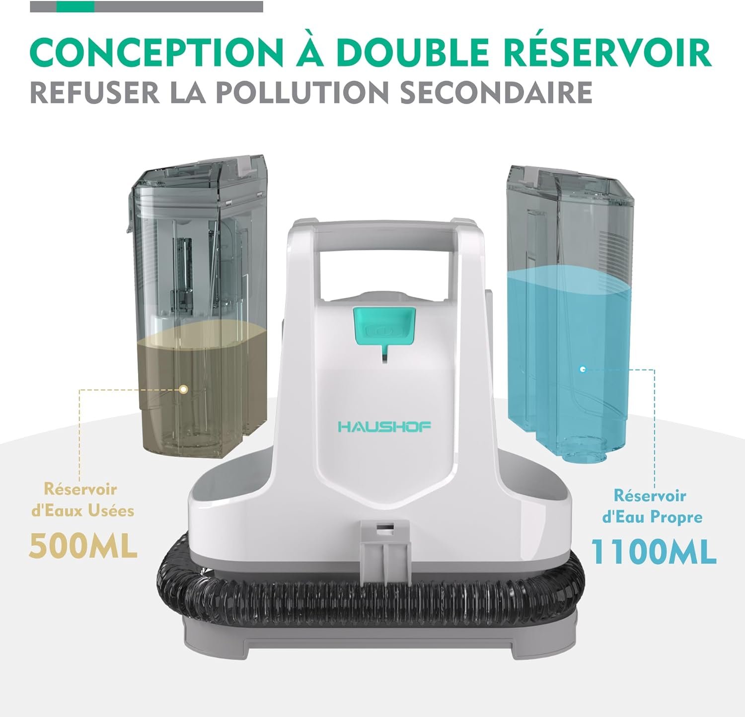 Dans cette même gamme de puissance, la shampouineuse Emphsism EV W01 400W propose également un système à double réservoir avec des capacités légèrement supérieures.