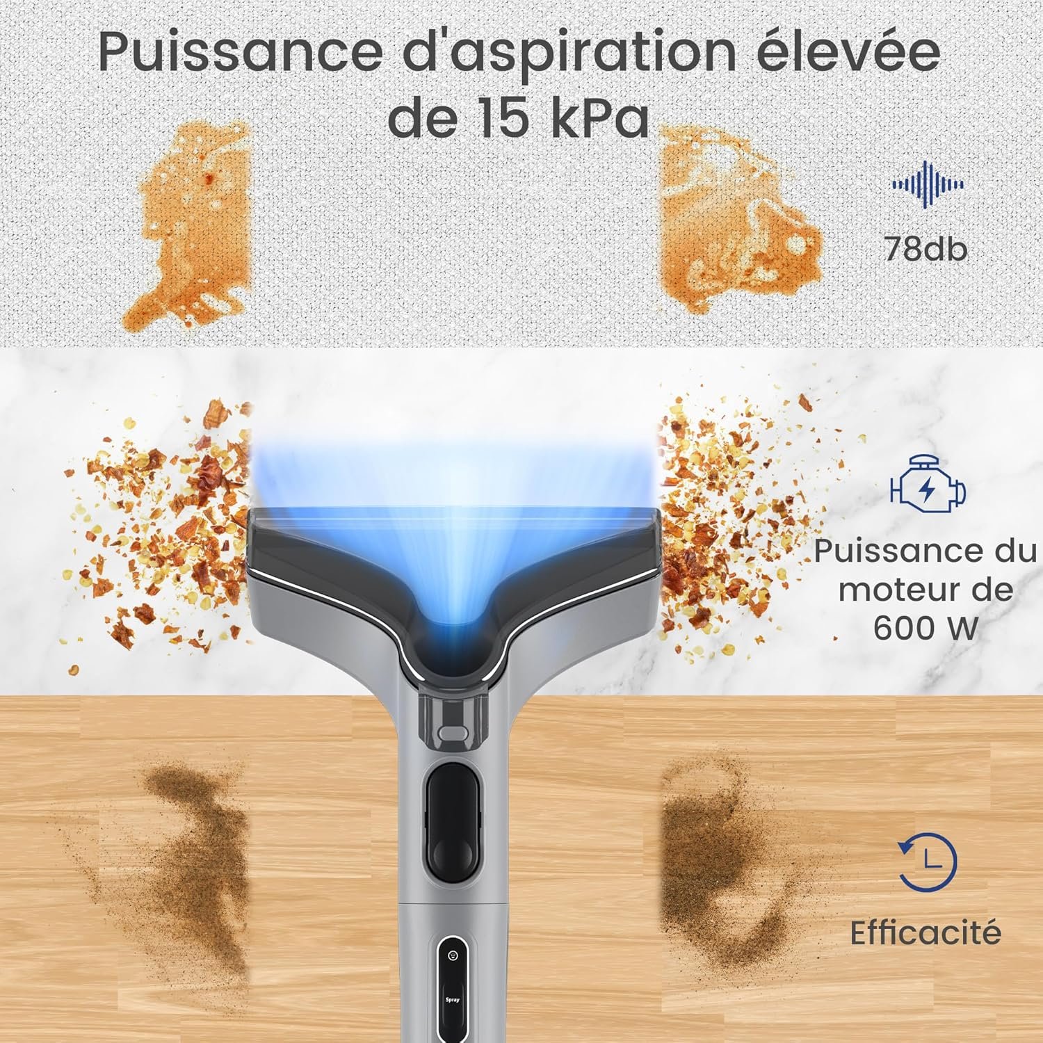 Le moteur de 600W place cette shampouineuse dans la catégorie milieu de gamme domestique régulier selon les standards du marché. Cette puissance s’accompagne d’une pression d’aspiration de 15 KPa qui, d’après les spécifications techniques, permet un « nettoyage en profondeur et efficace » des coussins et textiles d’ameublement.