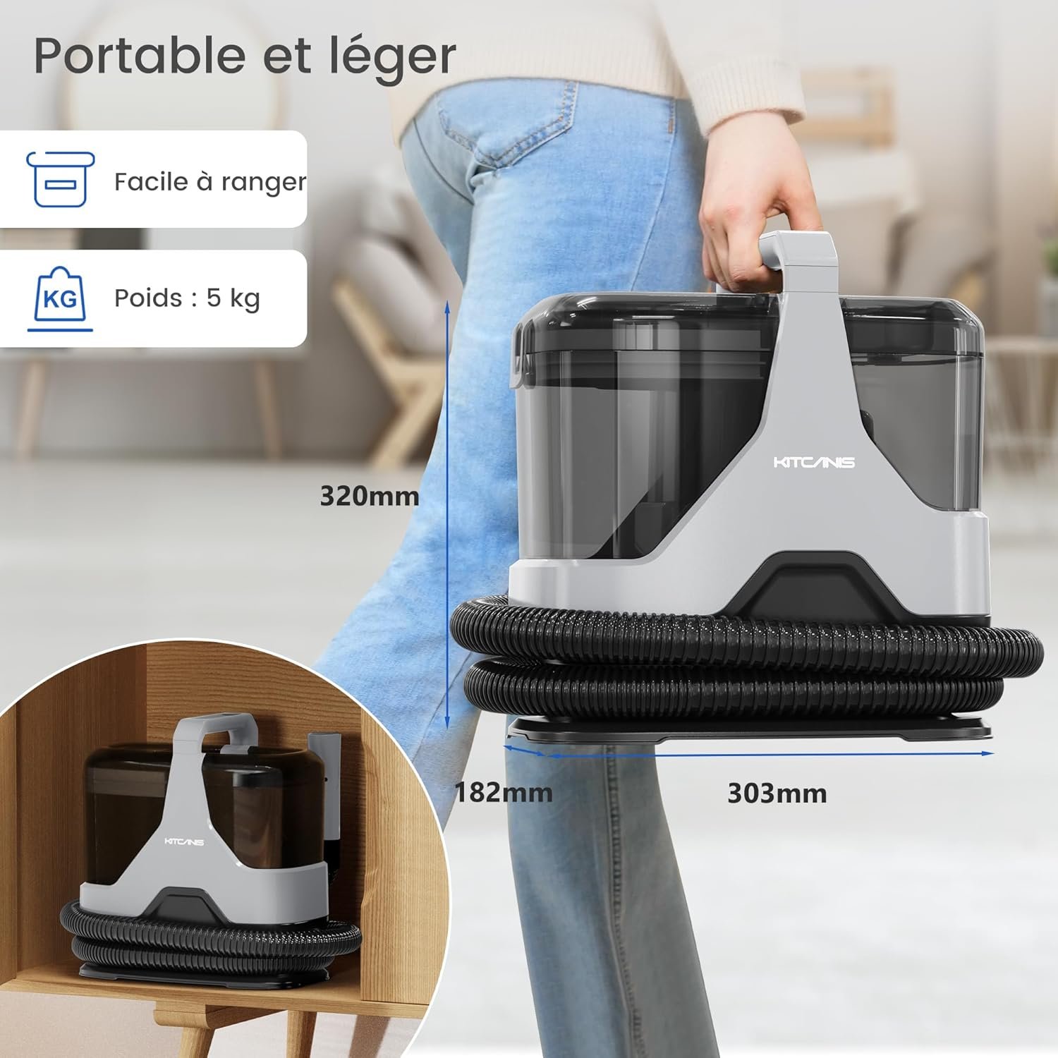 Les dimensions de 18,2 x 30,3 x 32 cm et le poids de 4,76 kg confirment le format portable de cette shampouineuse. Cette conception compacte répond aux besoins de stockage réduit tout en conservant une maniabilité acceptable pour les sessions de nettoyage domestiques.