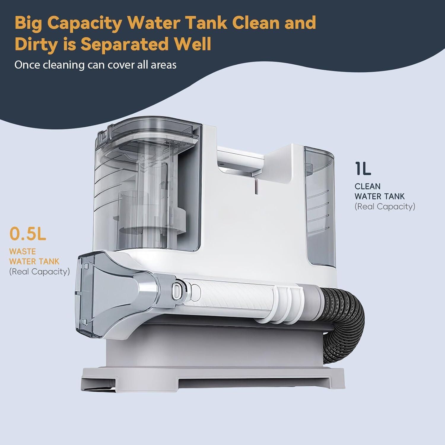 Cette capacité totale de 1.5L la range dans la catégorie usage ponctuel, adaptée aux canapés et surfaces moyennes domestiques selon le référentiel technique. Le système de séparation limite la contamination croisée pendant le nettoyage.