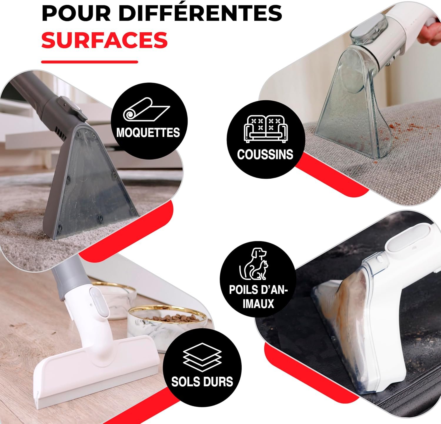 ✅ Polyvalence (tapis, moquettes, canapés, sièges auto, sols durs)