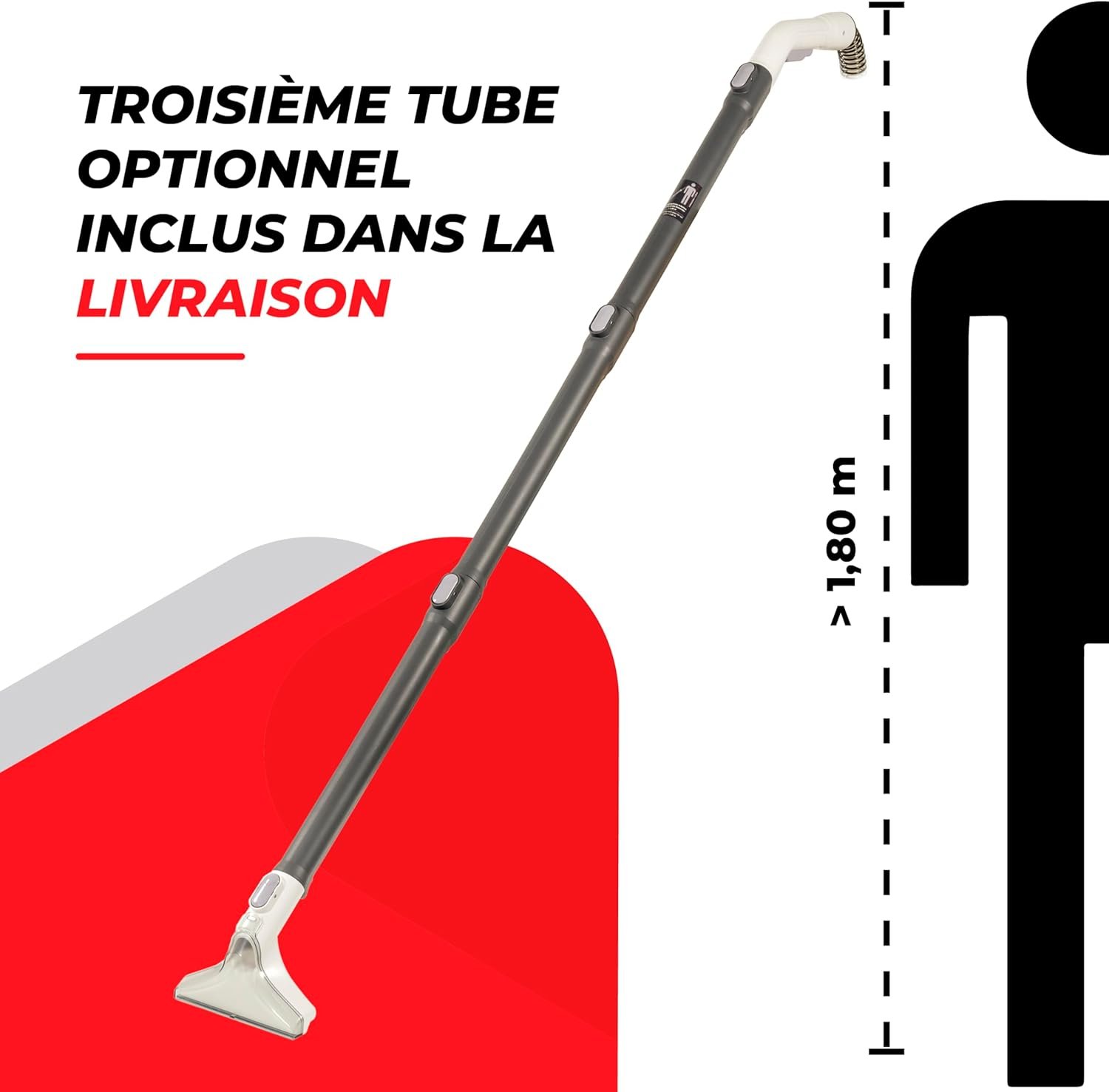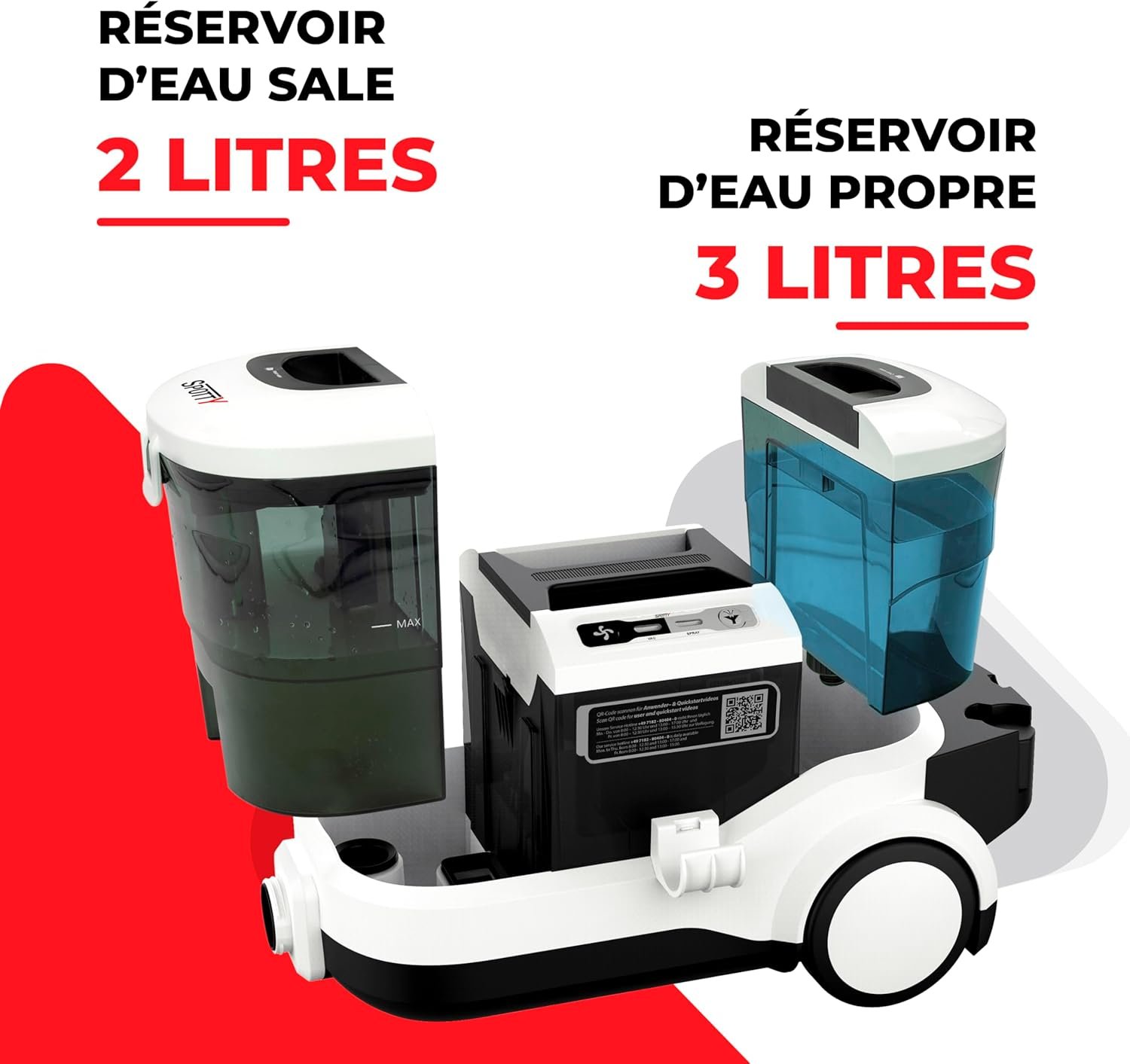 L’équipement comporte quatre buses spécialisées selon le fabricant : suceur moquettes, suceur coussins, suceur poils d’animaux et suceur sols durs/fenêtres. Un flacon de détergent concentré est inclus. D’après les avis utilisateurs, certains remarquent un déséquilibre entre le nombre d’accessoires fournis et les emplacements de rangement disponibles. Les réservoirs transparents facilitent le contrôle visuel du niveau de remplissage et trois emplacements de rangement sont prévus à l’arrière de l’appareil.
