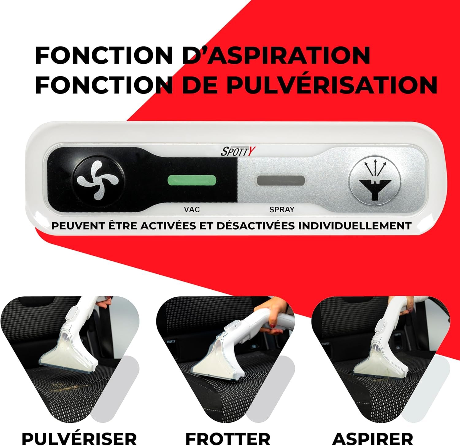Le SPOTTY fonctionne sur le principe d’injection-extraction, c’est-à-dire pulvérisation de solution nettoyante puis aspiration immédiate des salissures dissoutes. Selon le fabricant, les fonctions de pulvérisation et d’aspiration peuvent être activées et désactivées séparément depuis le panneau de commande. D’après les avis utilisateurs, une méthode fréquente consiste à mouiller la surface, brosser jusqu’à une mousse légère, puis aspirer en plusieurs passages.