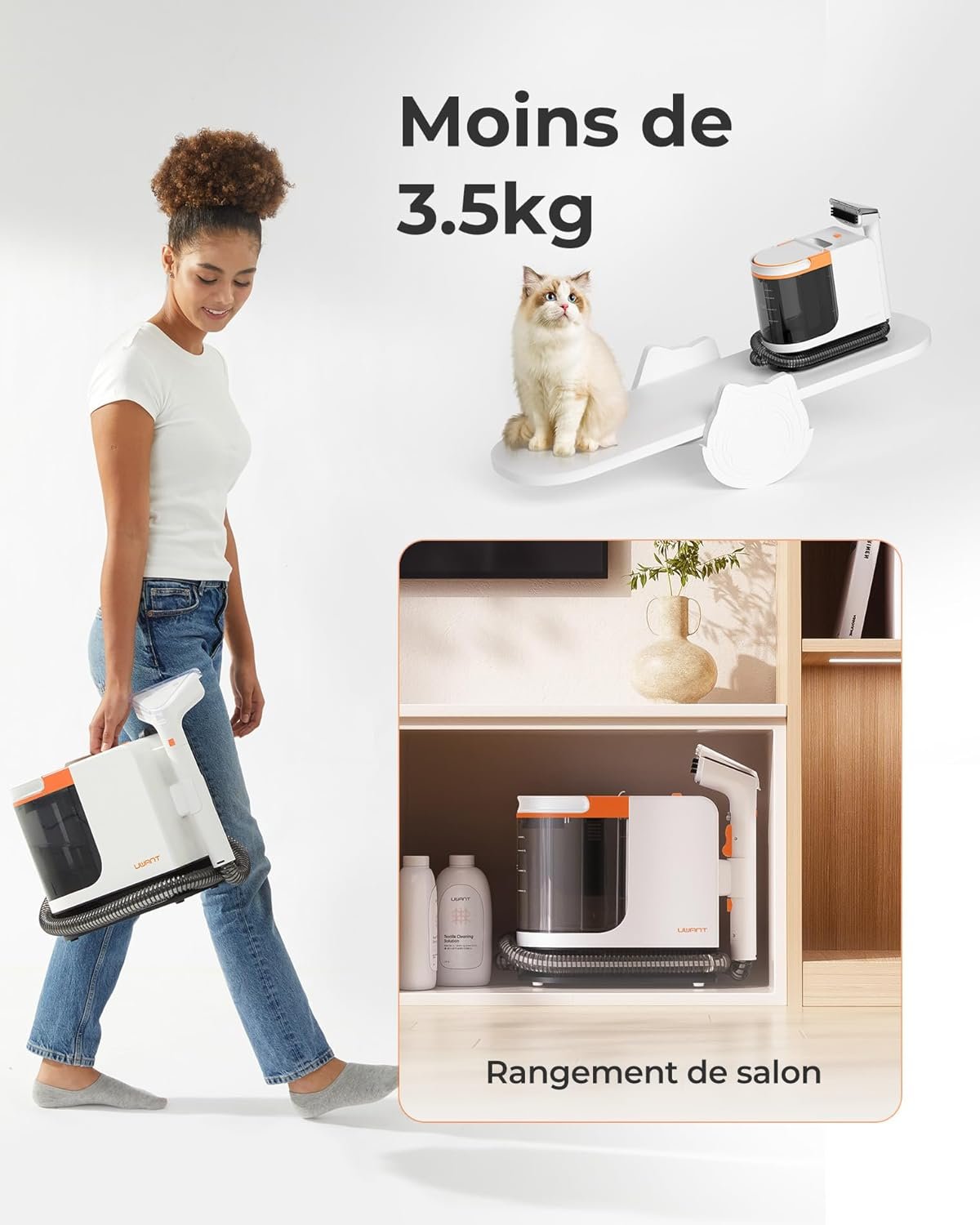 Dans le segment des shampouineuses portables, l’Uwant B200 SE se présente comme un modèle d’entrée de gamme conçu pour un usage domestique ponctuel. Avec une puissance moteur de 450 watts, elle se situe dans la catégorie 300-600W, répondant ainsi aux besoins ciblés du nettoyage occasionnel. Son moteur et son poids de 3,5 kg la rendent adaptée aux utilisateurs recherchant un appareil maniable pour l’entretien régulier des tissus d’ameublement. Toutefois, sa conception axée sur la portabilité implique que les sessions de nettoyage peuvent être plus longues sur de grandes surfaces par rapport aux modèles professionnels de type traîneau.