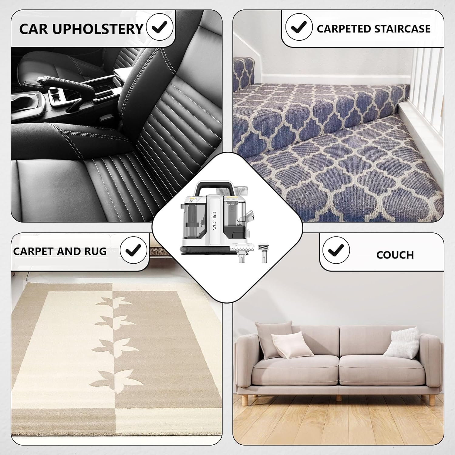 Les témoignages collectés mettent en avant la polyvalence du Vonia pour plusieurs usages : entretien des sièges automobiles, nettoyage des canapés en tissu lors d’incidents domestiques, rafraîchissement de matelas à l’occasion d’un ménage saisonnier. Un utilisateur signale brièvement que « limpia y funciona bien », soulignant une efficacité globale sur différents supports.